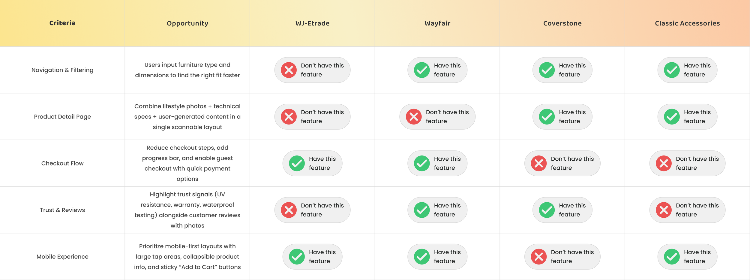 Objective: by understanding how competitors in the outdoor furniture cover market structure their user experience and identify opportunities to improve product discovery, trust, and checkout flow for WJ-Etrade